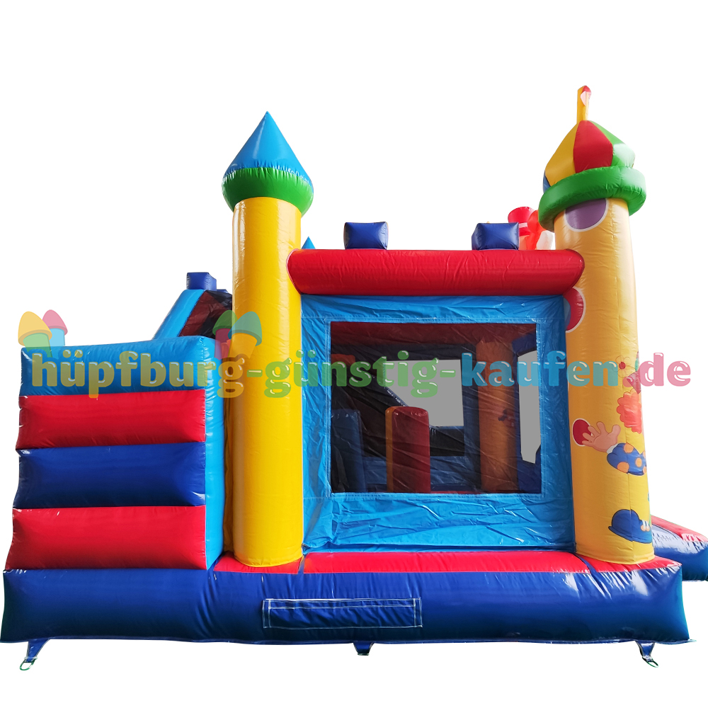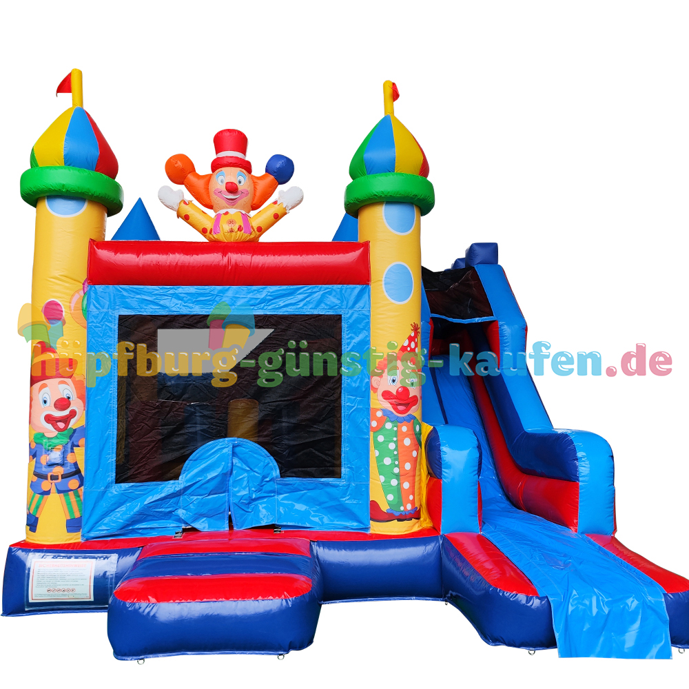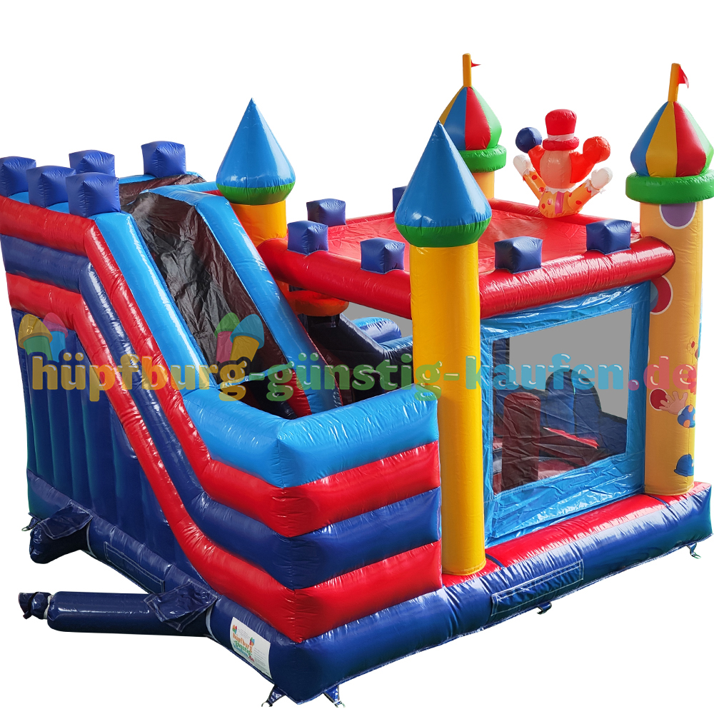 Kommt heran und betretet unser „Zirkuszelt“. Unsere kombinierte Hüpfburg mit Rutsche empfängt ihre kleinen Gäste mit farbenfrohen Türmen, einem großen Clown über dem Eingang und lädt seine Besucher dazu ein viele unterhaltsame Stunden beim Hüpfen, Klettern und Rutschen zu verbringen.